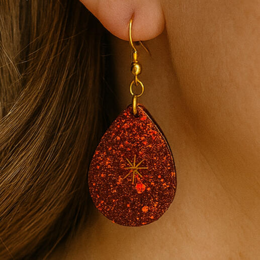 Rich, warm, and full of festive sparkle. These handcrafted earrings blend deep red shimmer with bright flecks of gold for a bold, joyful holiday look.Available in sterling silver, gold-plated, or hypoallergenic clear plastic.$12